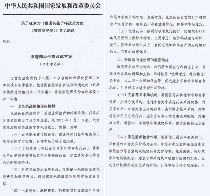 據(jù)悉2014年11月25日,國家發(fā)改委向8個行業(yè)協(xié)會下發(fā)了關于征求對《推進藥品價格改革方案(征求意見稿)》意見的函。在此之前發(fā)改委藥品價改方案已經(jīng)多方意見征求,征求對象包括地方物價系統(tǒng)、衛(wèi)計委及人社部等相關政府部門。