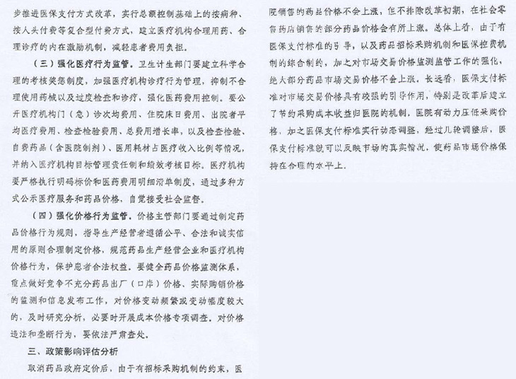 取消藥品政府定價后,由于有招標采購機制約束,醫(yī)院銷售藥品價格不會上漲。但不排除改革初期,零售藥店銷售部分藥品價格會有所上漲??傮w來看,由于有醫(yī)保支付標準引導,以及招標采購機制和醫(yī)保控費機制綜合制約(價格放開后未來主要價格管理應由衛(wèi)計委和醫(yī)保部門負責),加之對市場交易價格監(jiān)測監(jiān)管強化(物價部門主要職責是加強市場監(jiān)管)。絕大部分藥品市場交易價格不會上漲。長遠看醫(yī)保支付標準對市場交易價格有較強引導作用。特別是建立節(jié)約采購成本收益歸醫(yī)院機制,醫(yī)院有動力壓低藥價,加之醫(yī)保支付標準實時動態(tài)調整,經(jīng)過幾輪(壓價)調整后,醫(yī)保支付標準就可以反映市場真實情況。使藥品市場價格保持在合理水平上。